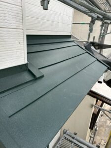 現場は勾配が約5寸とやや急勾配の屋根で、通常よりも安全管理・作業手順に配慮が必要な条件でしたが、職人同士の連携を取りながら、無事きれいに仕上げることができました。