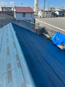 下屋根も同様にルーフィングシートを張って、新しい屋根材を葺いていきます。