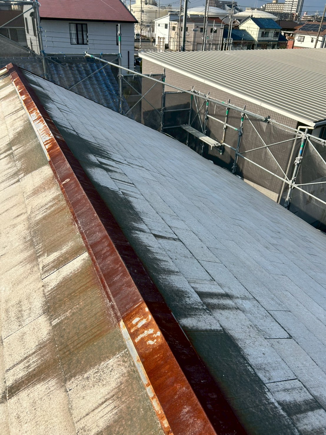 既存屋根はスレート屋根で、棟板金の錆がかなり進行していました。