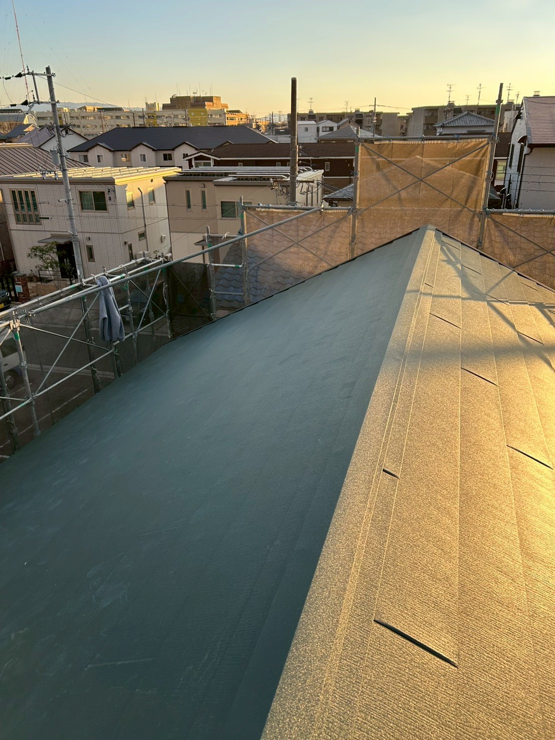 現場は勾配が約5寸とやや急勾配の屋根で、通常よりも安全管理・作業手順に配慮が必要な条件でしたが、職人同士の連携を取りながら、無事きれいに仕上げることができました。
